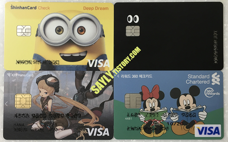 아래 던전앤파이터하나체크카드는 디자인종류가 여러개입니다. 출시된지는 조금되었지요. 옆에 SC은행의 디즈니 리워드체크카드는 지금은 단종되었지만 다른 모양의 디즈니 캐릭이 있으니 참고하세요. 점점 디자인의 형태도 디자인이라고 볼수없을정도로 아예 없는 형태로 나오는거보니 실물카드도 이젠 없어지는게 느껴집니다.