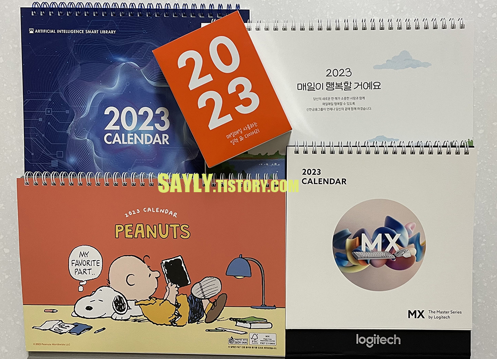 그래도 신한은행달력은 하나 건졌내요. 하나는 업체 꺼고 일력달력도 받았는데 아마도 메모지를 쓸듯합니다. 항상 받는 알라딘 스누피달력과 올해 마우스를 하나 장만했는데 로지텍에서 달력도 와서 언박싱할 때 깜짝 놀랐네요. 사이즈도 아담한 게 딱 주 달력으로 좋네요.