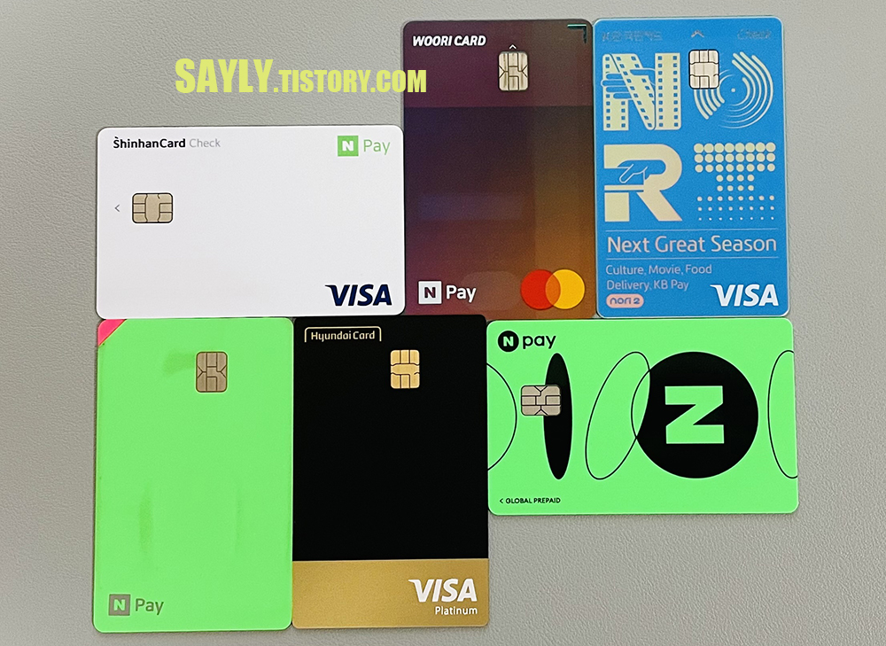 2023년 발급받은 신용카드와 체크카드들입니다. 네이버페이 종류가 압도적인 이유는 제가 네이버쇼핑과 네이버페이를 집중적으로 이용하고 적립하는 관계로 전부 다 녹색입니다.