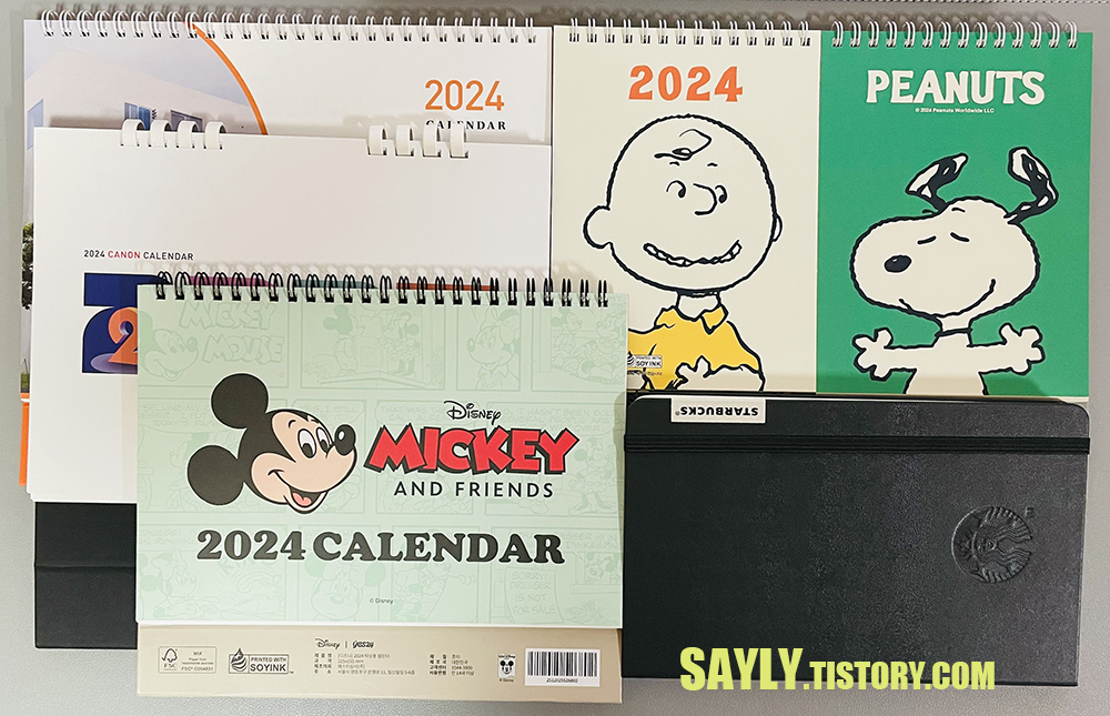예스24는 알라딘의 영향인지 올해부터 캐릭터, 그것도 미키마우스가 등장합니다. 진작에 할 것이지, 그리고 알라딘은 전통적인 스누피, 게다가 종류도 여러 가지로 저는 이번에 분할되는 달력인데 진짜 예쁘게 보는 용도의 달력입니다. 마지막으로 달력은 아니지만, 스타벅스 프리퀀시로 모아놓은 게 아까우니 검정 다이어리로 선택했습니다. 그냥 노트로 사용 예정입니다.