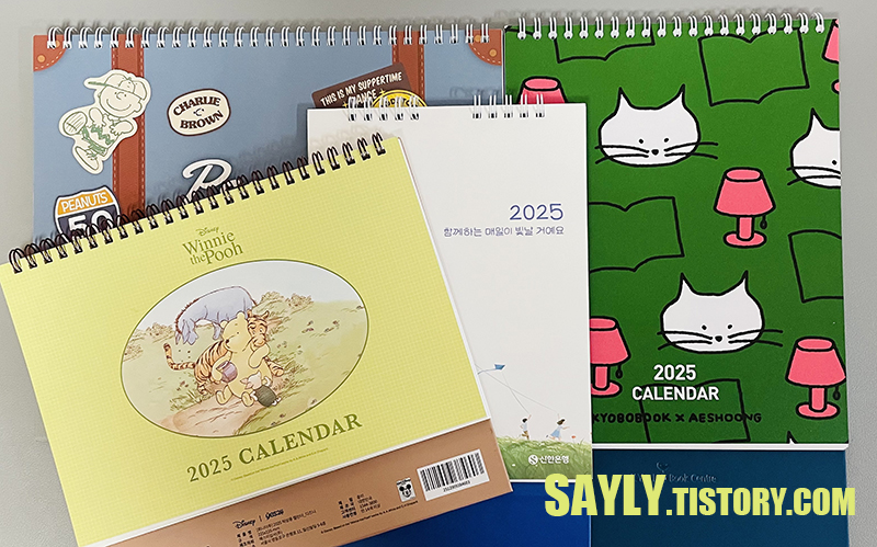 실용적인 건 좋은데 한 30% 모자란 감이 있는 느낌입니다. 알라딘은 전통적으로 피너츠로 두 가지 종류가 나왔고 예스24는 곰돌이푸우로 새로워졌네요. 교보문고는 달력이벤트가 있는지 이번에 처음 알았네요. 애슝콜라보달력입니다. 다이어리는 별로 사용을 안 하는데 이번 사무실 다이어리와 수첩이 너무나 고급져서 막 쓰고 싶은 느낌입니다. 사진이 없는 게 안타깝네요.