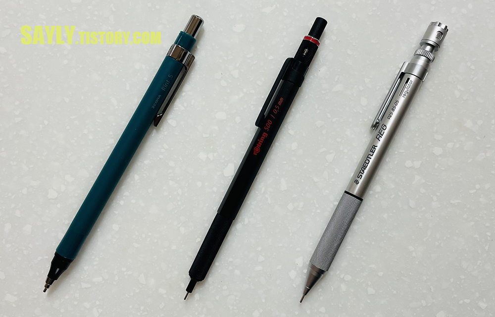 마지막은 브랜드를 먼저 선정하고 고른 건데 스테들러 유명하죠. 그중에 심 조절을 할 수 있는 REG 925 85를 선택했는데 그것보다 그립감과 손이 편합니다. 그립 부분도 로트링 500과 같아서 편하고 무게와 몸통 딱 좋네요. 인생 샤프를 만난 것처럼 항상 사용하고 있던 느낌입니다.